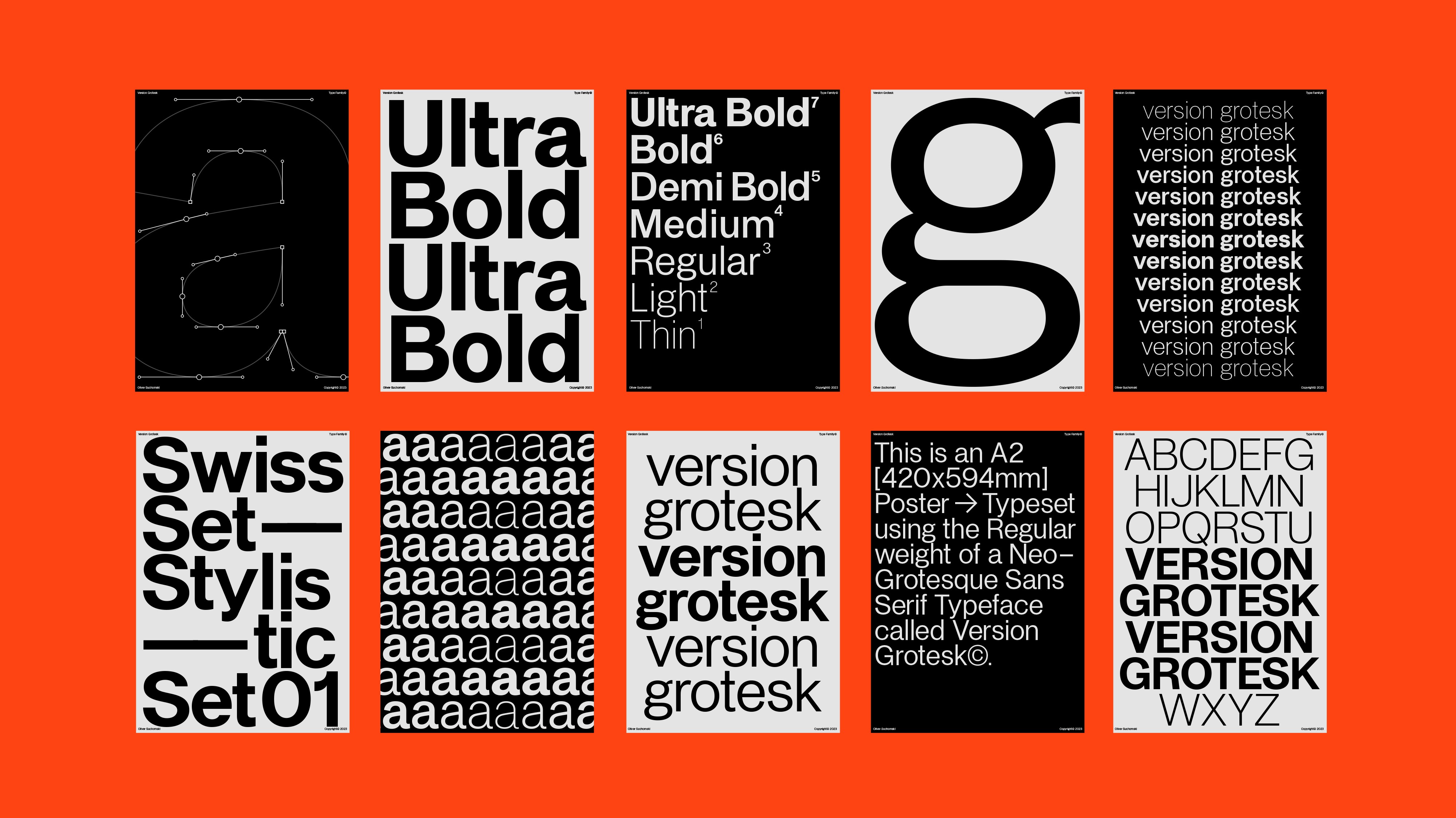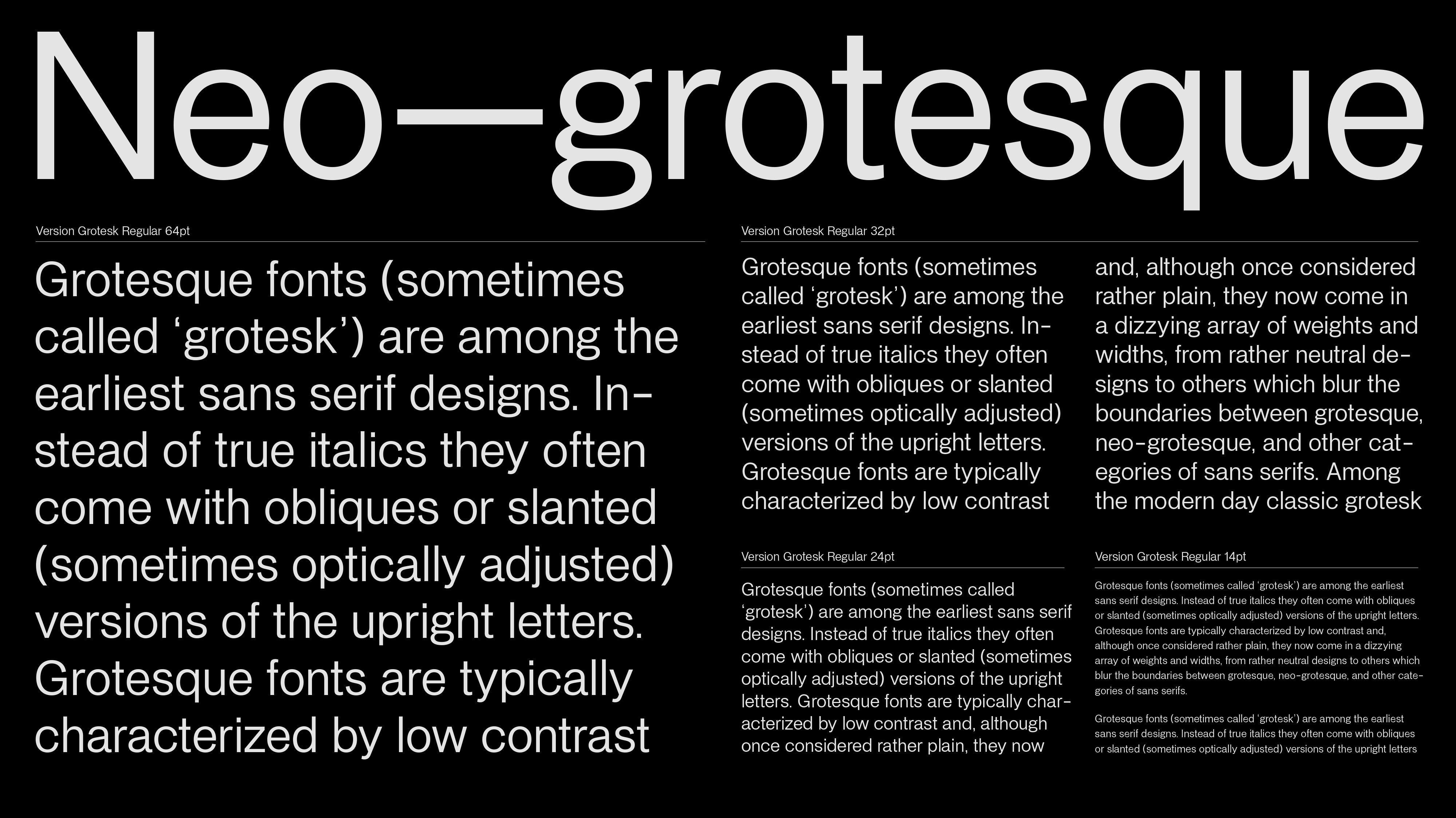 Version Grotesk is a neo-grotesque typeface inspired by classic 20th century sans serifs, with added flair due to its sharp, angled terminals and my personal interpretations on Latin letterforms.